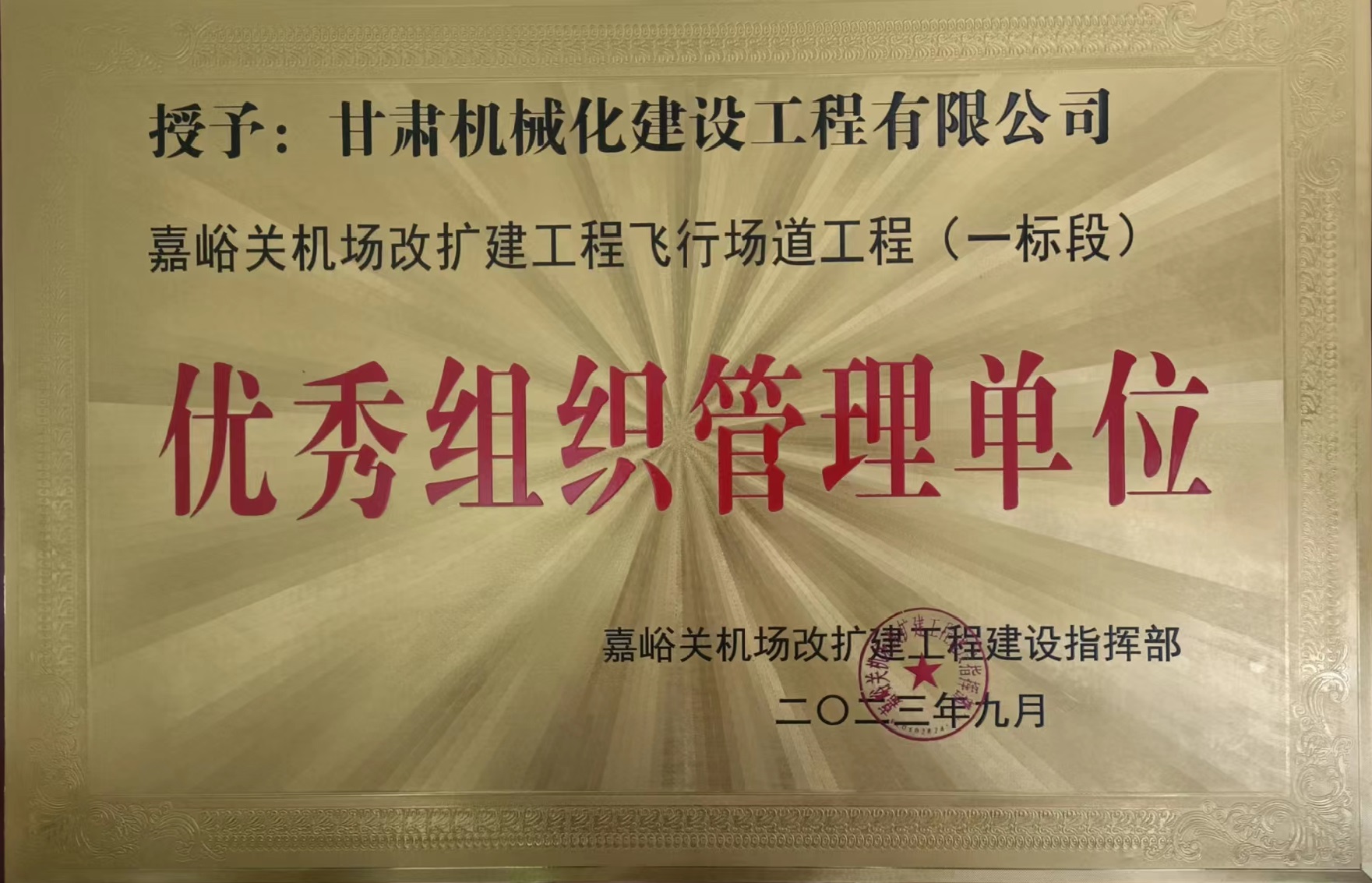 嘉峪關機場改擴建工程飛行場道工程 (一標段)優秀組織管理單位